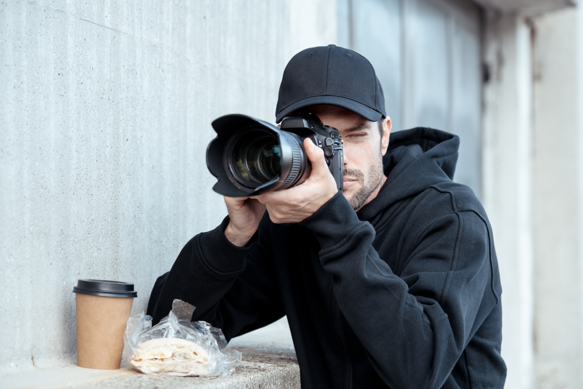 观鸟中年男性灰色连帽卫衣橙色袖口专注严肃双手拿望远镜远眺人像照片