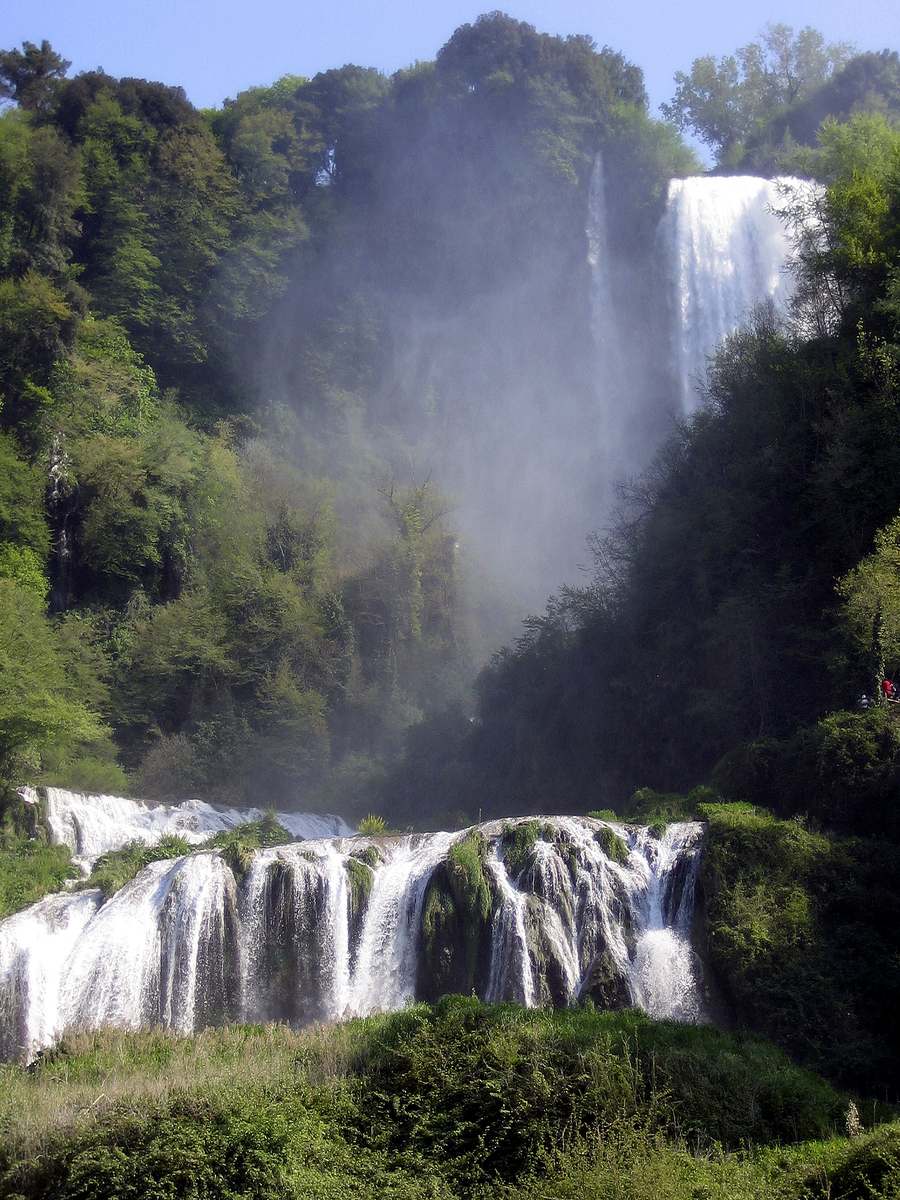 行至山间,见瀑布如练,訇然泻落,声震山谷,溅起的水花似玉珠纷洒,在